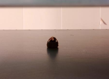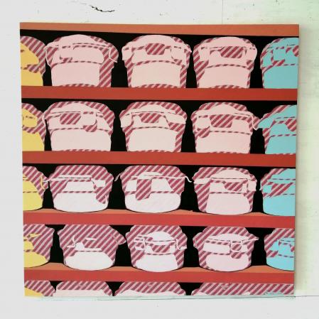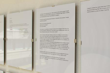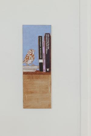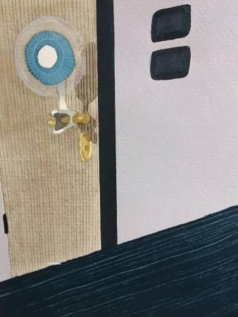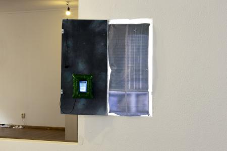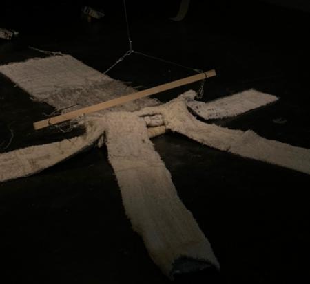 Getting Comfortable in your Skin-suit is een installatie met vier sculpturen van schroothout en een film die grotendeels bestaat uit archiefmateriaal van door de Amerikaanse overheid gemaakte/gedistribueerde video's, als onderdeel van een voortdurende verkenning van waarheid en de performativiteit ervan. In de installatie zijn de figuren zo gepositioneerd en geposeerd dat ze een gezin in een woonkamer nabootsen dat televisie kijkt. De scène is geïnspireerd op lifestyle-illustraties uit Amerika in de jaren 60 en 70. Deze illustraties zijn van bijzonder belang voor deze installatie omdat ze een specifiek cultureel ideaalbeeld weergeven van hoe een gezin eruitziet en zich gedraagt, wat ook in de film wordt weerspiegeld. De figuren zijn echter, in tegenstelling tot hun gewone en herkenbare situatie, monsterlijk van formaat en vorm. Ze zijn ongeveer twee meter hoog in zittende positie en bedekt met de scherpe randen van het versplinterde hout en de roestige spijkers waaruit ze bestaan. De figuren dragen elk grote maskers gemaakt van huishoudelijke voorwerpen zoals een raamkozijn of kastdeur, over platte, onopvallende gezichten. Binnen de scène die ik heb gecreëerd, zie ik de figuren als performers die een huiselijke scène naspelen die puur door deze performance bestaat om het publiek te overtuigen van de werkelijkheid van hun werkelijkheid. Het is dit contrast tussen presentatie en performance dat het werk primair interesseert. Op de muur wordt een archieffilm van iets minder dan een half uur geprojecteerd. De film maakt gebruik van archiefbeelden en audio uit het Amerikaanse Nationaal Archief om te bespreken hoe een zelf wordt geconstrueerd en alles wat erbij komt kijken om een zelf te creëren en de juiste manier om dat te doen. Het gebruik van opnieuw bewerkt archiefmateriaal, en met name materiaal van de Amerikaanse overheid, zorgt voor een tweede stem. Een tweede stem die een duidelijke en historische agenda heeft gehad in het pushen voor en voorschrijven van de manier waarop een zelf zich zou moeten presenteren en presteren. Foto gemaakt door Dustin James