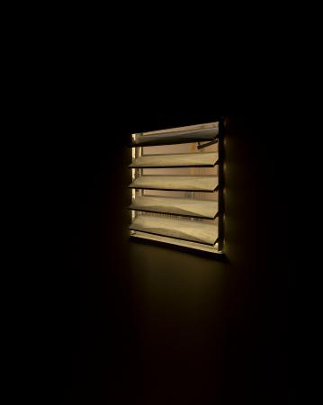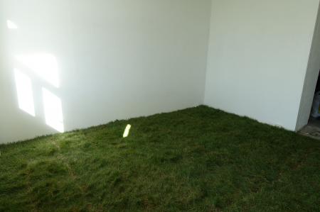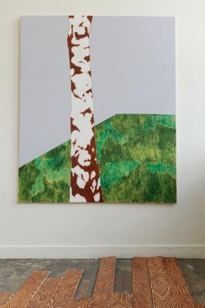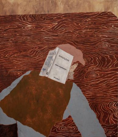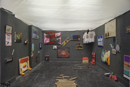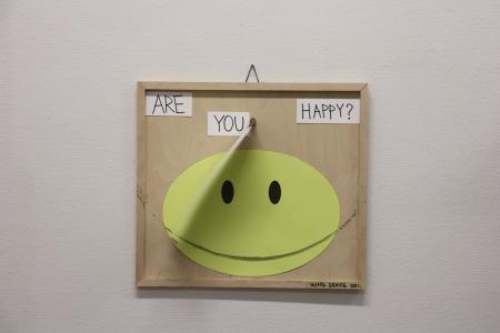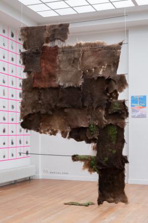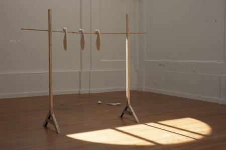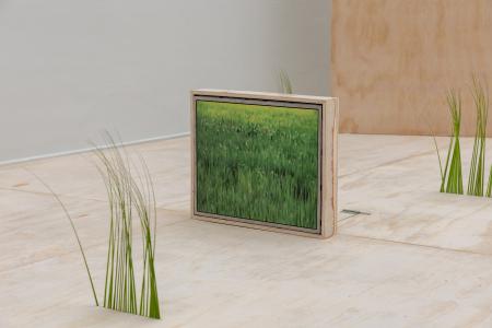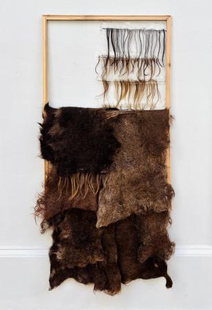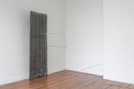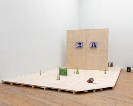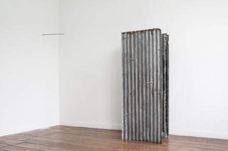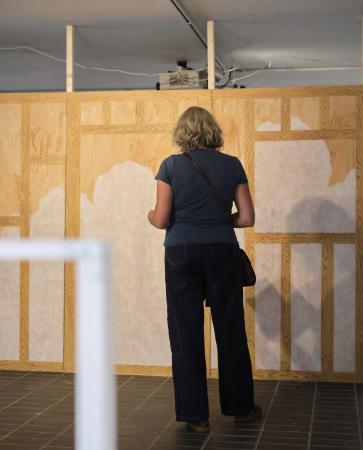 Getting Comfortable in your Skin-suit is een installatie met vier sculpturen van schroothout en een film die grotendeels bestaat uit archiefmateriaal van door de Amerikaanse overheid gemaakte/gedistribueerde video's, als onderdeel van een voortdurende verkenning van waarheid en de performativiteit ervan. In de installatie zijn de figuren zo gepositioneerd en geposeerd dat ze een gezin in een woonkamer nabootsen dat televisie kijkt. De scène is geïnspireerd op lifestyle-illustraties uit Amerika in de jaren 60 en 70. Deze illustraties zijn van bijzonder belang voor deze installatie omdat ze een specifiek cultureel ideaalbeeld weergeven van hoe een gezin eruitziet en zich gedraagt, wat ook in de film wordt weerspiegeld. De figuren zijn echter, in tegenstelling tot hun gewone en herkenbare situatie, monsterlijk van formaat en vorm. Ze zijn ongeveer twee meter hoog in zittende positie en bedekt met de scherpe randen van het versplinterde hout en de roestige spijkers waaruit ze bestaan. De figuren dragen elk grote maskers gemaakt van huishoudelijke voorwerpen zoals een raamkozijn of kastdeur, over platte, onopvallende gezichten. Binnen de scène die ik heb gecreëerd, zie ik de figuren als performers die een huiselijke scène naspelen die puur door deze performance bestaat om het publiek te overtuigen van de werkelijkheid van hun werkelijkheid. Het is dit contrast tussen presentatie en performance dat het werk primair interesseert. Op de muur wordt een archieffilm van iets minder dan een half uur geprojecteerd. De film maakt gebruik van archiefbeelden en audio uit het Amerikaanse Nationaal Archief om te bespreken hoe een zelf wordt geconstrueerd en alles wat erbij komt kijken om een zelf te creëren en de juiste manier om dat te doen. Het gebruik van opnieuw bewerkt archiefmateriaal, en met name materiaal van de Amerikaanse overheid, zorgt voor een tweede stem. Een tweede stem die een duidelijke en historische agenda heeft gehad in het pushen voor en voorschrijven van de manier waarop een zelf zich zou moeten presenteren en presteren. Foto: Ira Gruen
