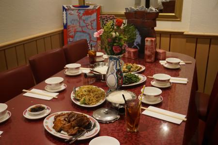 Foto van de poppen aan de eettafel.