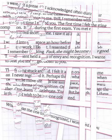 Premonition bestaat uit twaalf gipsafdrukken van een digitaal gebeeldhouwd en vervolgens geprint zelfportret. Elk van de hoofden is ongeveer zo groot als mijn eigen hoofd en is verminkt door een repetitief proces, waarbij er met een hamer een stalen staaf doorheen werd geslagen of er herhaaldelijk met een koevoet op werd geslagen in patronen die lijken op echte gezichtsletsels uit medische tijdschriften. In deze serie onderzocht ik een meer metaforische obsessie met de conceptuele vernietiging van het zelf als een waar en geloofd wezen door de fysieke vernietiging van mijn gelijkenis via een intens fysiek, arbeidsintensief proces. Bovendien was het voor mij, bij het creëren van de gelijkenis, belangrijk om mijn hoofd te boetseren in plaats van te scannen voordat ik het printte, wat resulteerde in een afgietsel van een afdruk van een 'handmatig' gerenderd digitaal object. Net als bij het zelf moesten zowel het vervaardigen als de vernietiging van deze objecten arbeidsintensief en tijdrovend aanvoelen.