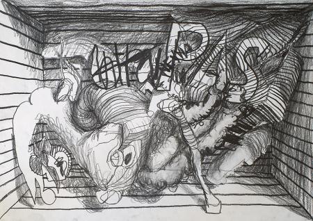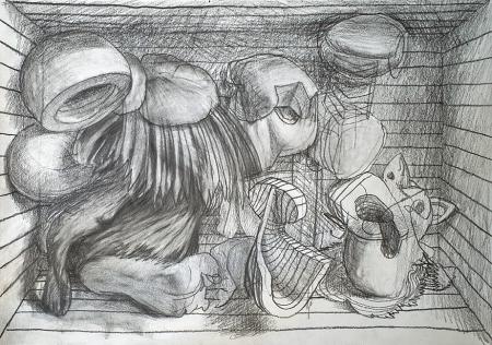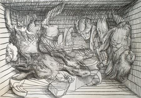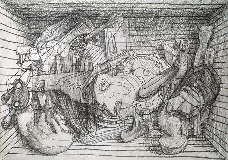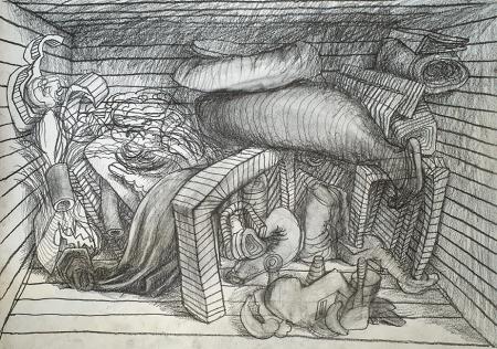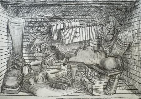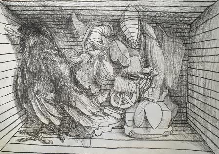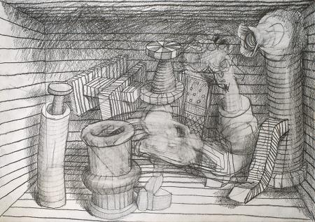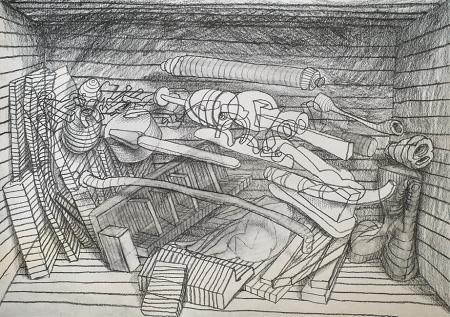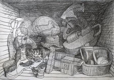 Mijn werk grijpt sterk terug naar etsen en gravures van weleer. Daar zit ruimtelijkheid en lichtval in en ze zijn vaak anecdotisch. Die gegevens gebruik ik als een soort uitgangspunten. Het is fascinerend dat je met lijnen zetten een soort realiteit kunt creëeren, een plek die toegankelijk is met dingen die tastbaar zijn. Je moet daarvoor wel een soort wetmatigheden volgen. Een lijn heeft dan een functie: deze lijn is de omtrek van een vorm, bijvoorbeeld een tafelpoot. Deze lijntjes vormen samen de schaduw daarvan op de grond (samen heten ze arcering). Tijdens het tekenen ben ik mij bewust van deze identiteit van de lijn. Het grote verschil tussen mij en een tekenaar uit de zeventiende eeuw is dat ik daar niet aan vastzit. Ik kan allemaal lijnen zetten zonder functie of de functie achteraf bedenken. Ik kan vrij bewegen en reageren op wat er gebeurt. Dat is de kern van waaruit mijn tekeningen ontstaan. De combinatie van het expressieve of abstrakte met het duidbare brengt een soort onderbewuste naar boven. Een plek die tegelijkertijd toegankelijk en ontoegankelijk is.